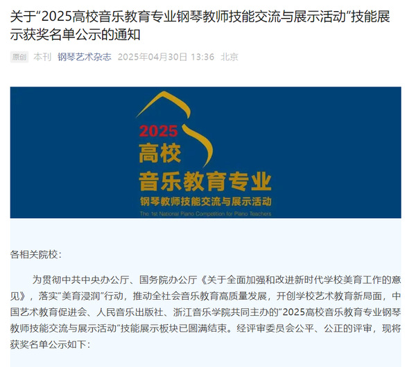 本次活动由中国艺术教育促进会、人民音乐出版社、浙江音乐学院联合主办,《钢琴艺术》编辑部、浙江音乐学院音乐教育学院、浙江音乐学院钢琴系共同承办,以“美誉浸润传承创新”为主题,设置了钢琴独奏、重奏、声乐艺术指导、歌曲伴奏即兴编配等四大组别,吸引了来自全国专业院校、师范院校、综合类院校及高职院校的500多名钢琴专业教师报名参赛,是近年来国内高校钢琴教育领域规模大、水平高、影响力强的活动之一。