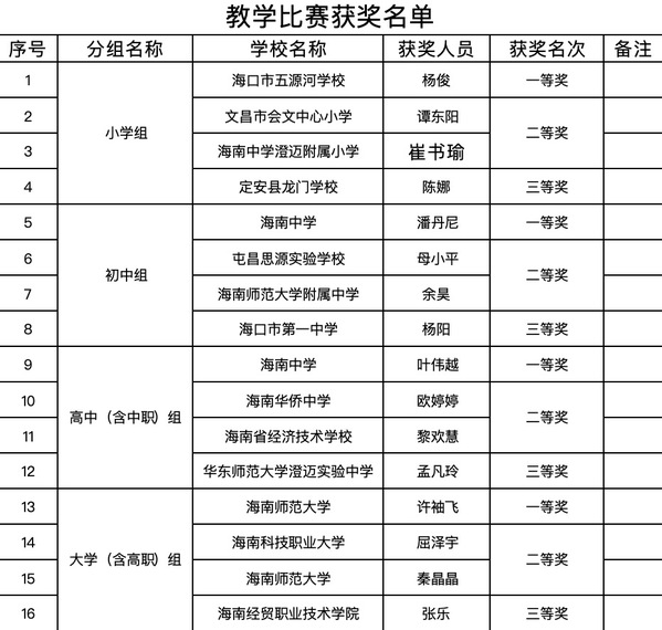 经过激烈角逐,海口市五源河学校杨俊获、海南中学潘丹尼、海南中学叶伟越、海南师范大学许袖飞分别获得小学组、初中组、高中(含中职)组、大学(含高职)组一等奖,共12位选手入围2025年海南省大中小学思政课一体化“同题异构”教学比赛。