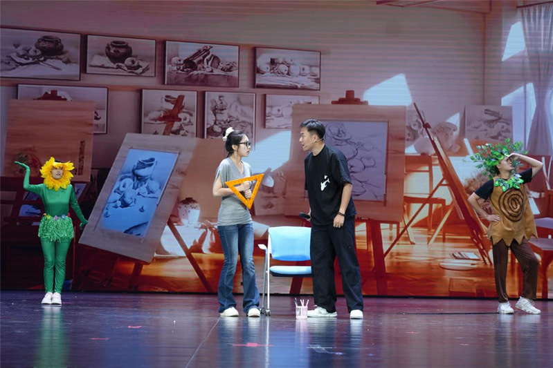 作品《逃尺》借助雕塑技术与童话隐喻等艺术手法,在舞台上勾勒出极具感染力的成长画卷,讲述了学生芽芽在追求完美的道路上逐渐迷失自我,最终学会接纳不完美、倾听内心声音的故事。芽芽执着追求完美,受严苛规则束缚,美术设计大赛获亚军后又被庄生报名陶塑比赛,创作陷入瓶颈并自我怀疑。幸得小泥巴鼓励,她勇敢突破束缚,丢掉心中的"尺子",凭借充满个性的陶塑作品在比赛中斩获第一名。通过这段经历,学生芽芽深刻领悟到成长无需被外界标准定义,勇敢做自己才是生命真谛的道理。