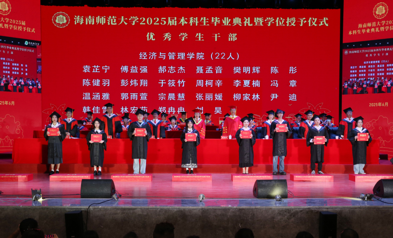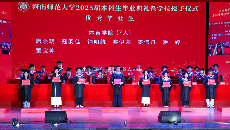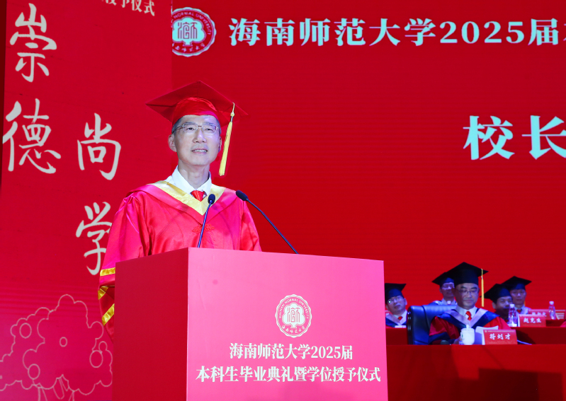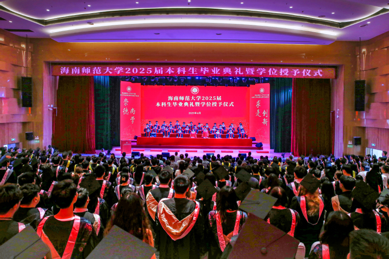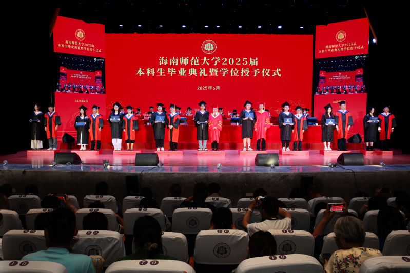 6月17日下午,海南师范大学2025届本科生毕业典礼暨学士学位授予仪式在桂林洋校区大学生活动中心演艺厅举行,共4533名本科毕业生被授予学士学位。校党政领导班子成员许玫、陈相松、符刘才、杨兹举、王瑜、徐基良、王任斌、黄忆军出席,机关职能部门及各学院负责人、教师代表、校友代表、家长代表及2025届本科毕业生参加仪式。典礼由校党委副书记符刘才主持。