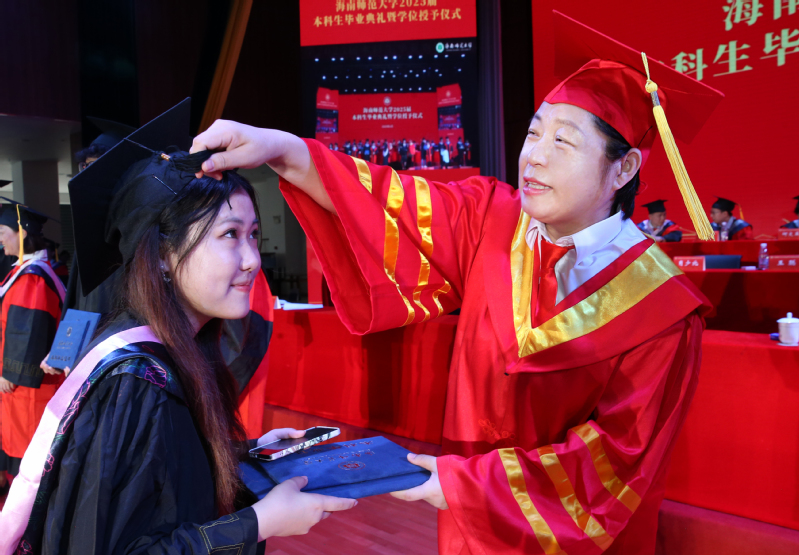 “椰风阵阵吹天涯,我们相聚在师大”,毕业典礼在全场合唱《海南师范大学校歌》声中落幕。