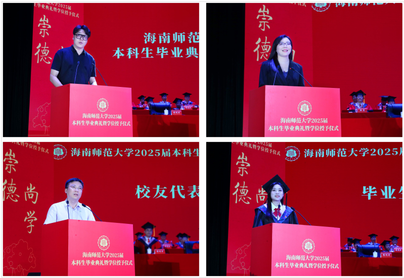 毕业典礼在庄严的国歌声中拉开帷幕。新闻传播与影视学院李欣柔作为毕业生代表向母校、师长表达深深的感恩之情,表示将始终践行“崇德尚学、求是创新”的校训,在更广阔的天地书写精彩人生。教师代表、法学院教师唐欣瑜叮嘱毕业生要永葆高度的责任心与使命感,以行动诠释青春的意义,用汗水和成果书写人生的辉煌篇章。校友代表、海口市第二十五小学党总支书记、校长赵檀木勉励毕业生要永葆谦逊品格、坚韧信念和高尚精神追求。