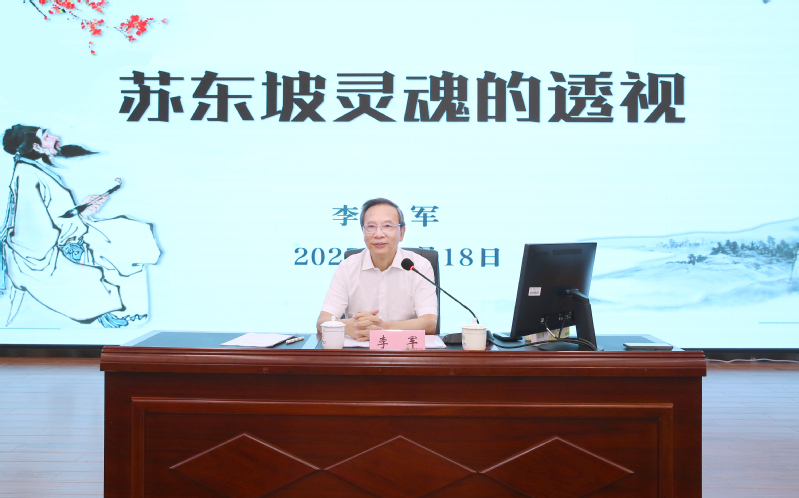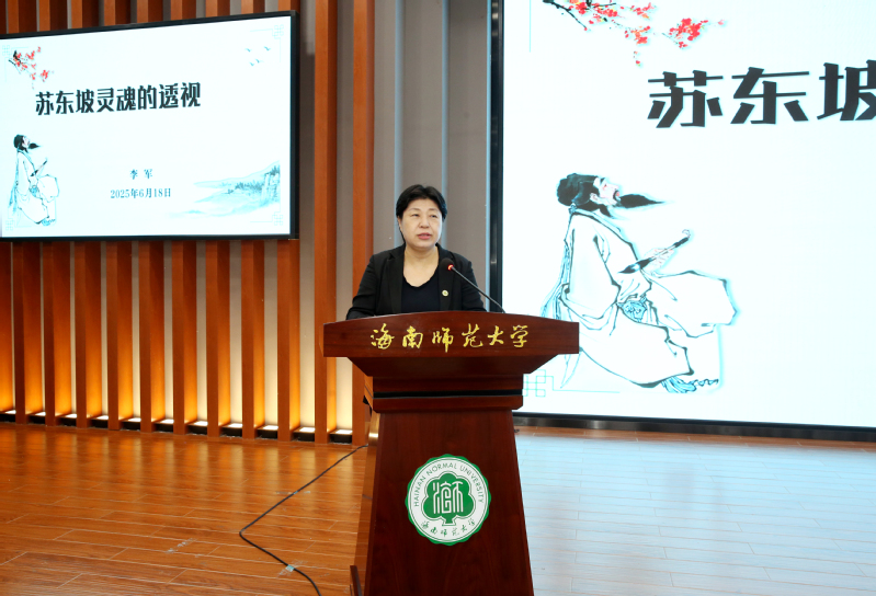 6月18日上午,海南省人大常委会党组书记、副主任李军应邀为我校师生作题为“苏东坡‘灵魂’的透视”的文化讲座。讲座由校党委书记许玫主持。