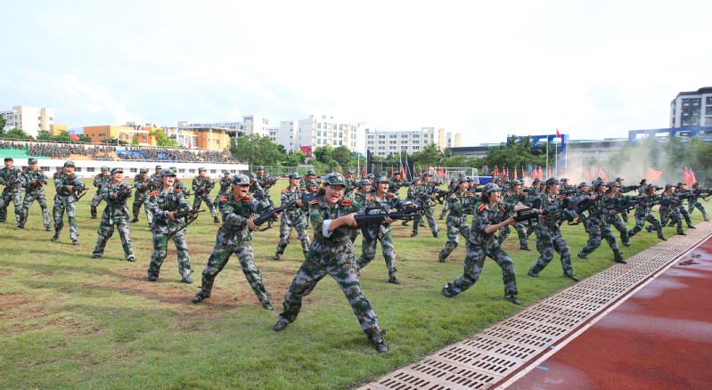 大会在庄严的升旗仪式中拉开帷幕。国旗护卫队步伐铿锵,升起鲜艳的五星红旗。分列式上,各连队方阵依次经过主席台,同学们身姿挺拔、步伐有力,口号响亮激昂,尽展蓬勃朝气与昂扬风貌。军事科目展示表演将现场气氛推向高潮:刺杀操方阵动作刚劲、气势如虹;匕首操方阵手持短刃,动作干净利落;百面战旗方阵旌旗猎猎,如烈焰翻腾;擒敌拳方阵拳风凌厉,势如破竹;战术方阵则以战斗队形展开演练,卧倒、匍匐、出枪一气呵成。同学们用专注的神情、熟练的动作和迷彩服上的汗水,向14天军训交出了满意的答卷。