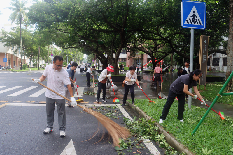 校领导带头深入一线、靠前指挥,与全体党员干部和师生一同投入劳动。大家按区域划分成若干小组,明确责任范围,手持扫帚、铁锹等工具,有序开展清扫落叶、拖运断枝、扶正加固倒伏树木等工作,尽管汗水浸湿衣衫,但师生们依然热情不减,持续奋战。全校上下众志成城,协同作战、紧密配合,高效、有序推进各项清理任务,按下灾后恢复“快进键”。