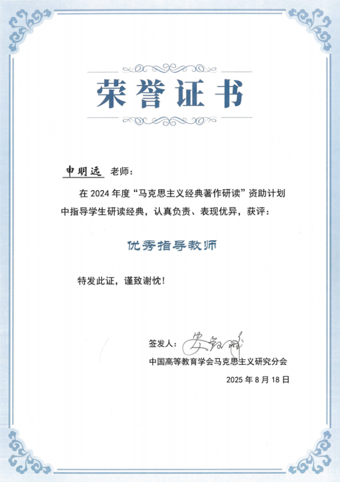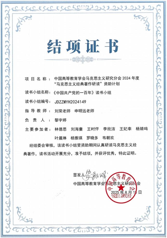在近日结束的中国高等教育学会马克思主义研究分会2024年度“马克思主义经典著作研读”资助计划评选中,海南师范大学《中国共产党的一百年》读书小组凭借卓越的表现与丰硕的成果,成功通过项目结项并荣获“优秀读书小组”称号,小组指导教师申明远荣获“优秀指导教师”。