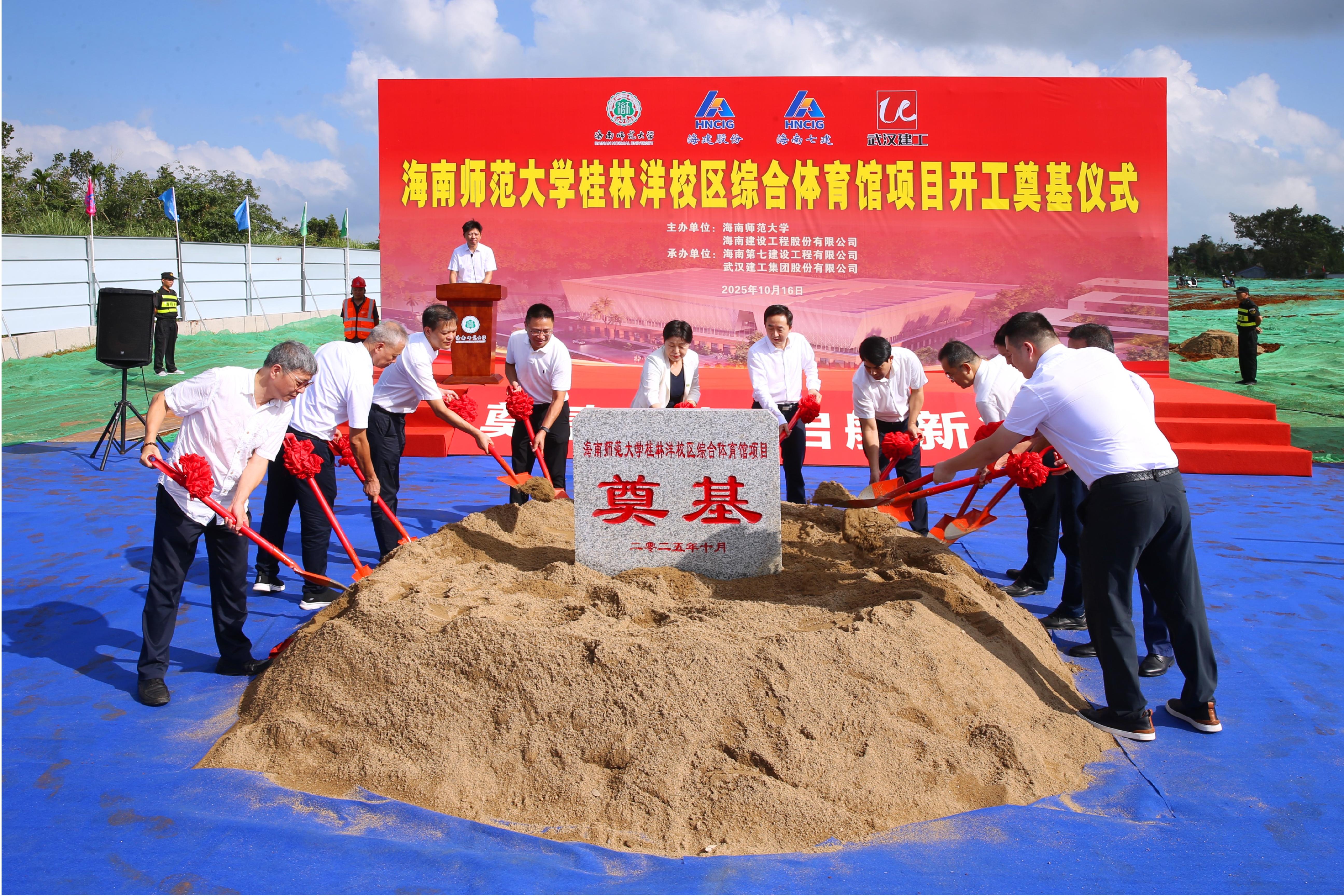 10月16日上午,海南师范大学综合体育馆项目开工典礼在桂林洋校区举行。我校党委书记许玫宣布项目正式开工,校长聂清斌、党委副书记符刘才、副校长张引,海口江东新区管理局副局长王国昌等出席典礼的领导和嘉宾共同为项目奠基石培土。