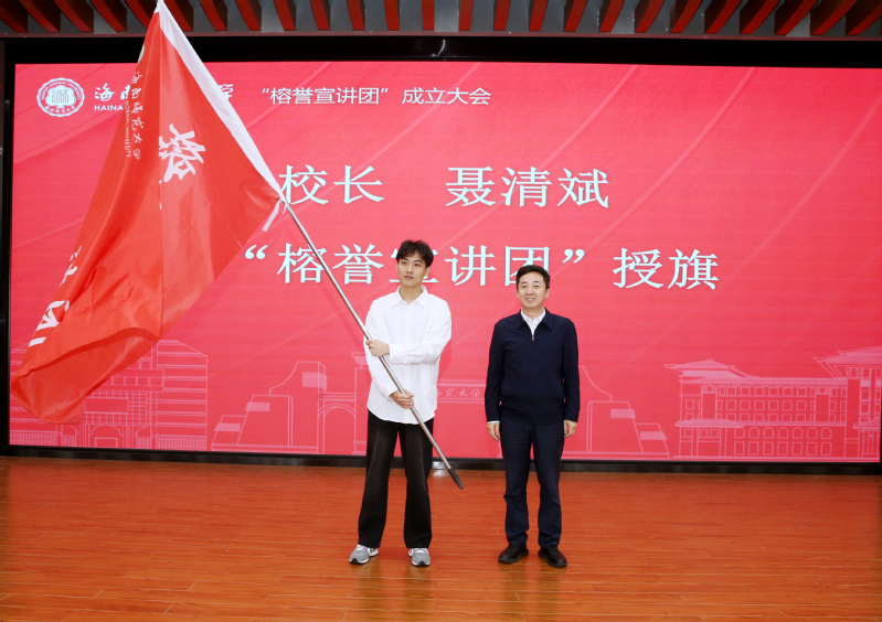 在激昂的乐曲声中,聂清斌为获得“非彤小可助学金”的学生代表颁发荣誉证书,并向“榕誉宣讲团”授旗。王瑜为宣讲团成员代表颁发聘书,标志宣讲团正式启航。
