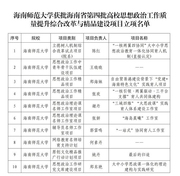 近日,海南省教育厅公布第四批高校思想政治工作质量提升综合改革与精品建设项目立项名单,我校共有10个项目成功获批,涵盖8个建设类别。