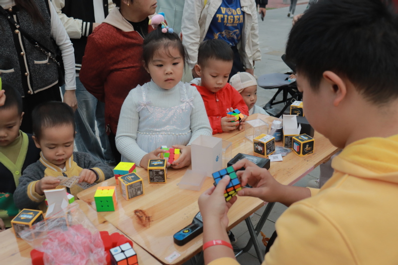活动现场内容丰富多元、亮点纷呈,涵盖魔术魔方教学、海龟保护科普、琵琶演奏教学及礼仪规范训练四大板块,满足了学生多样化的兴趣需求。在魔术协会开设的魔术魔方体验区,同学们围坐一堂,在志愿者的指导下动手拆解、反复尝试,在指尖灵动中锻炼逻辑思维与空间想象力,不时发出阵阵惊叹。海龟保护协会开设的科普专区前人头攒动,志愿者通过图文展示、趣味问答、实物模型讲解等形式,向同学们普及海洋生态保护知识,解读海龟生存现状与保护意义,唤醒大家的生态环保意识,传递“守护海洋家园”的责任担当。月半亭下,灼华汉章汉服社开设的演奏教学区则洋溢着古典韵味,专业演奏者指尖轻拨琴弦,《弱水三千》等经典曲目婉转悠扬,吸引众多同学驻足聆听、踊跃尝试,在一对一的教学指导中感受传统乐器的独特魅力,传承中华优秀传统文化。在大学生活动中心,大学生艺术团礼仪队带来的规范训练环节同样备受关注,队员们以标准的站姿、坐姿、走姿示范,细致讲解日常交往、公共场合中的礼仪规范,帮助同学们塑造良好仪态,提升综合素质。