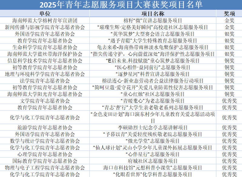 校团委将以此次大赛为契机,推动赛事成果转化为实践育人实效,引领全校青年志愿服务组织和青年志愿者勇担时代使命,为谱写中国式现代化海南篇章贡献青春力量。