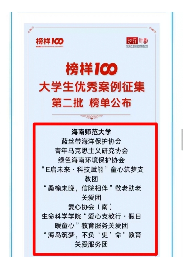 12月6日,“榜样100”全国大学生优秀案例榜单正式揭晓,我校9支社团与团队荣登榜单。入选社团和团队分别为蓝丝带海洋保护协会、青年马克思主义研究协会、绿色海南环境保护协会、“E启未来·科技赋能”童心筑梦支教团、“桑榆未晚,信院相伴”敬老助老关爱团、爱心协会(南)、生命科学学院“爱心支教行,假日暖童心”教育服务关爱团、“海岛筑梦,不负‘史’命”教育关爱服务团。