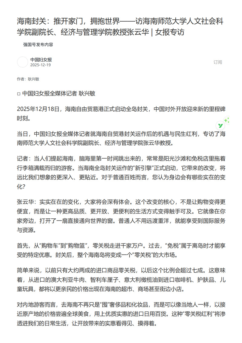 2025年12月19日,中国妇女报就海南自贸港封关运作后的机遇与民生红利,专访了我校人文社会科学院副院长、经济与管理学院张云华教授。