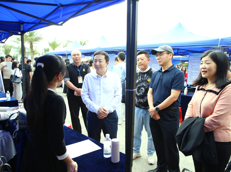 12月23日,2025年“海南学子,就在海南”留才行动暨“优企进校,招才引智”专项行动海南师范大学2026届毕业生冬季综合类专场招聘会在桂林洋校区大学生活动中心举办。校长聂清斌、副校长徐基良来到招聘会现场,与企业代表及招聘工作人员亲切交谈,了解招聘单位所属领域、岗位详情以及毕业生求职进展。