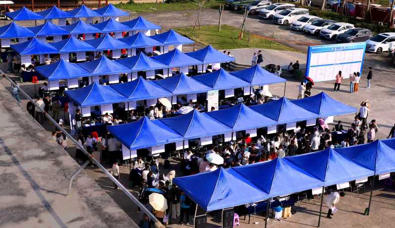 招聘现场气氛活跃,毕业生们踊跃投递材料。会场特设职业发展指导专区,提供政策咨询、简历优化、生涯规划等专项服务,引入智能AI就业辅助系统,配备便民服务点、指导服务站,为毕业生提供全方位择业支持。
