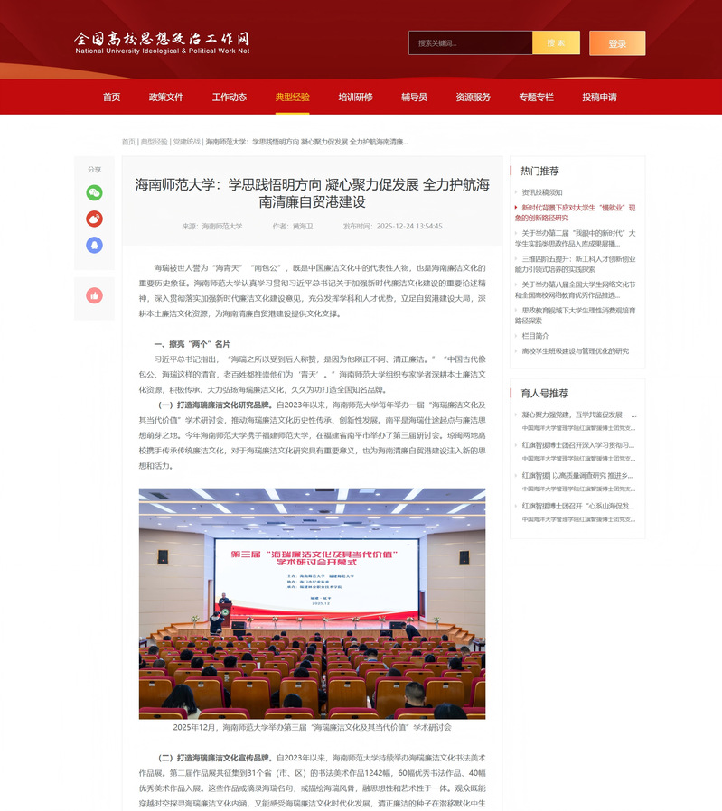 12月24日,全国高校思想政治工作网刊发我校教师黄海卫文章。文章以《学思践悟明方向 凝心聚力促发展 全力护航海南清廉自贸港建设》为题,介绍了我校认真学习贯彻习近平总书记关于加强新时代廉洁文化建设的重要论述精神,深入贯彻落实加强新时代廉洁文化建设意见,充分发挥学科和人才优势,立足自贸港建设大局,深耕本土廉洁文化资源,为海南清廉自贸港建设提供文化支撑。