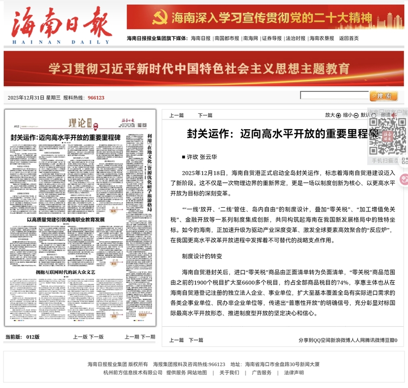 12月31日,《海南日报》刊发我校党委书记、教授、海南省中国特色社会主义理论体系研究中心副主任许玫、我校人文社会科学院副院长、教授张云华的文章《封关运作:迈向高水平开放的重要里程碑》。文章深入剖析了海南自贸港封关运作对于我国高水平开放的重要意义。